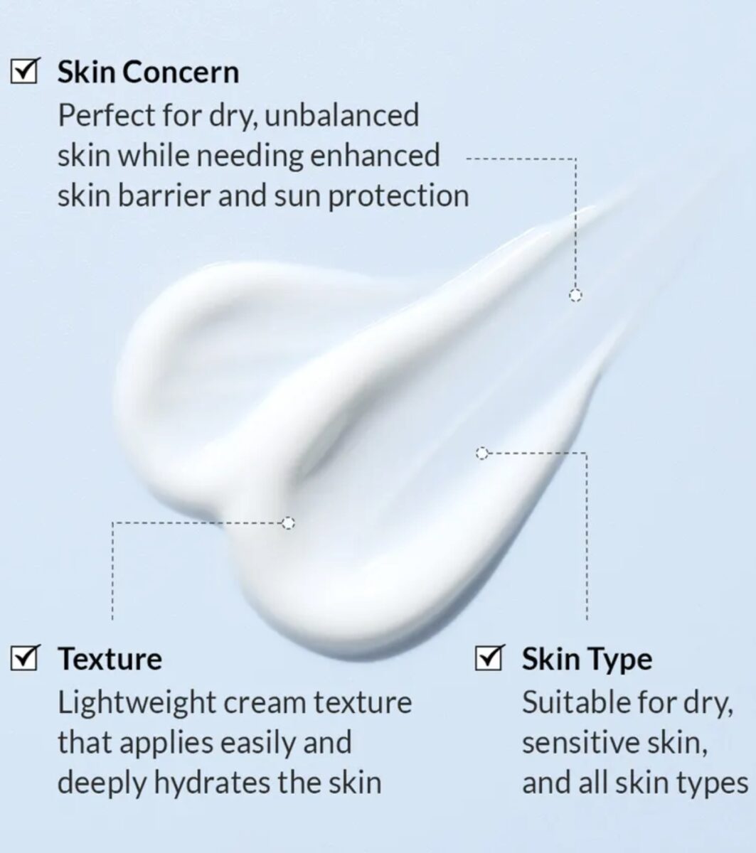 Enriquecido con niacinamida, ácido hialurónico, centella asiática y ceramidas, no solo protege frente a los rayos UV, sino que también mejora el tono, refuerza la barrera cutánea y calma la piel sensible.